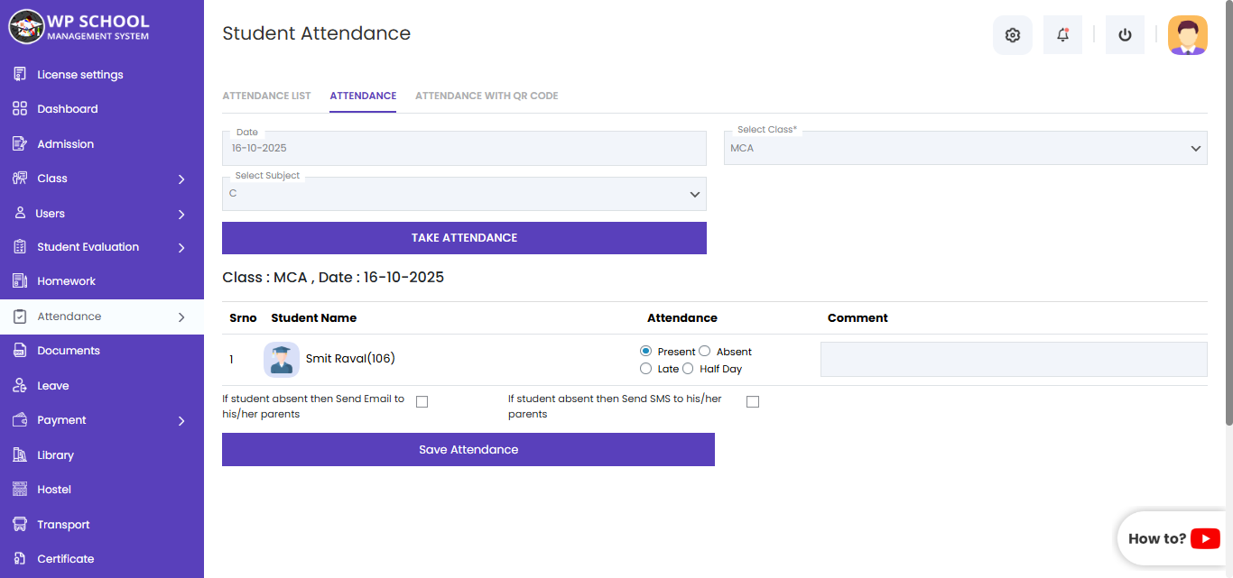 With this feature, you can record student attendance based on subject. Simply select the date, class, and the subject associated with that class. After clicking on "Take Attendance," a list of students enrolled in the selected subject will be displayed, allowing you to mark their attendance quickly and accurately