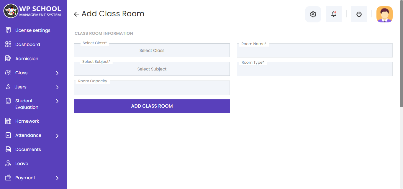 If the Enable Class Room option is enabled Class room option will visible in the class section.