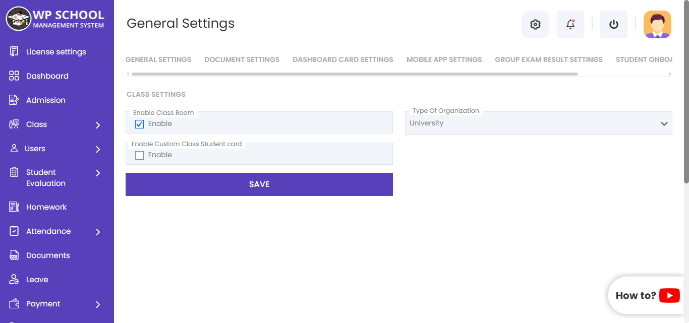 When the Type of Organization dropdown is set to University and the Enable Class Room checkbox is checked in General Setting, the Class Room feature becomes visible.