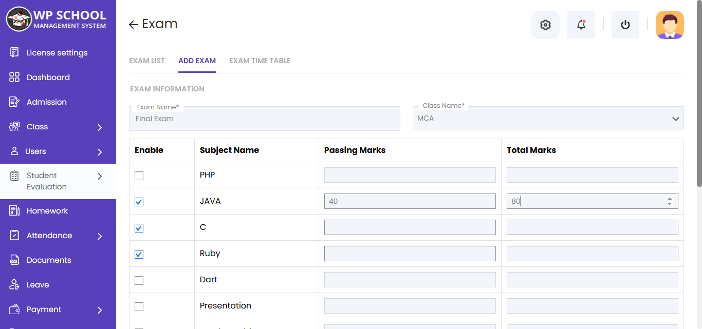 While adding an exam, once you select a class, the related subjects will be displayed. By checking the Enable checkbox, you can assign passing marks and total marks. After clicking Submit, the selected (enabled) subjects will be added to the exam.
