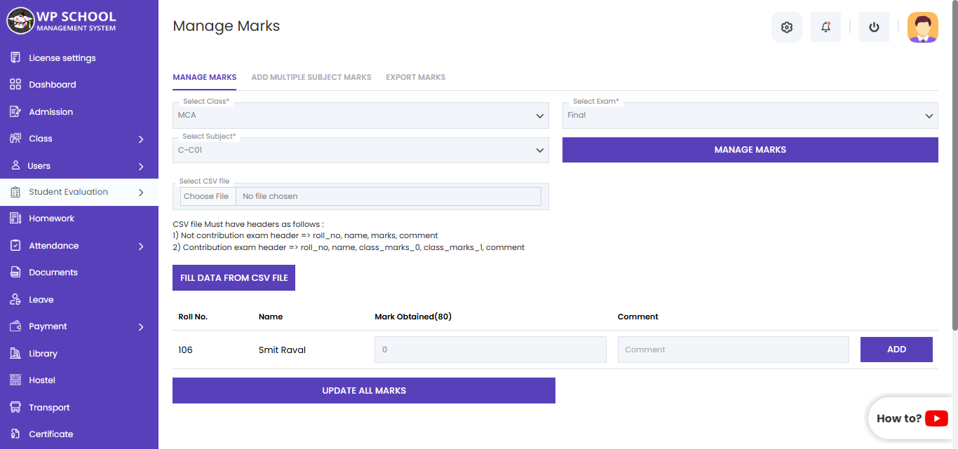 Teacher can also add multiple subject marks at once. For view Screenshot Click here.