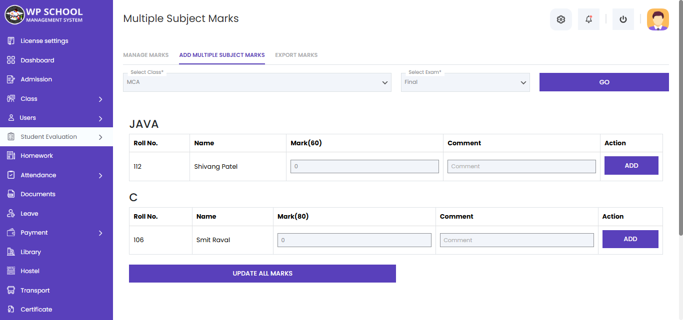 In this section, you can manage marks for multiple subjects simultaneously. Start by selecting the class and its associated exam. Once selected, a list of subjects related to that exam will appear, along with the corresponding list of students for each subject. This allows you to efficiently enter or update marks for multiple subjects in one place.