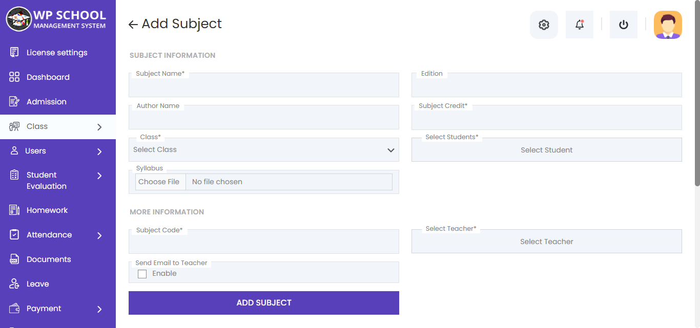 You can add a new Subject information with subject code ,Teacher name, Class name, Auther name and Edition of the book and also attach syllabus of the subject and view all list of Subjects.